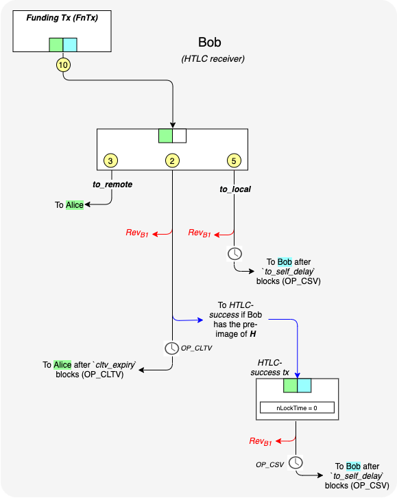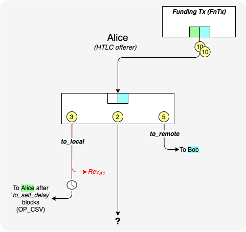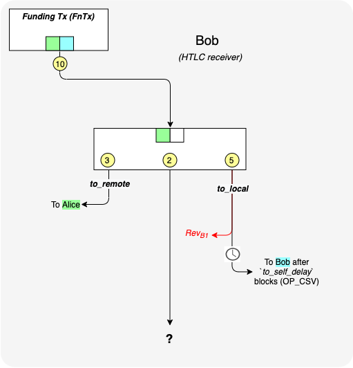 - One 3 BTC output with two possible spending paths: One spendable by Alice after a to_self_delayand one immediately spendable by Bob if he has the required revocation key (see post 2 and post 3 for more details on revocation).