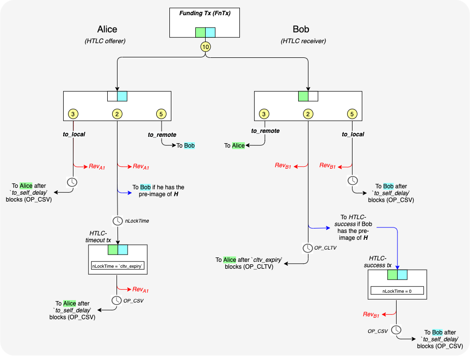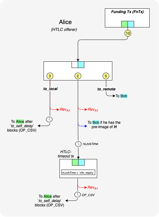 There is still a problem: Making the output to Alice encumbered by both these timelocks could in the worst case extend the HTLC’s timeout by to_self_delay. In other words, Bob could have an extra to_self_delay blocks in order to sweep the hash-locked output even though the HTLC is technically expired. So what is done instead is that instead having this output being locked by both timelock conditions, it is instead only locked by just the cltv_expiry one and then instead of sending funds to Alice directly, the funds are instead sent to a separate HTLC-timeout transaction (signed by both Alice and Bob) and this separate time out transaction then enforces the to_self_delay. This allows Alice to definitively lock in the fact that the HTLC has expired and removes Bob’s ability to claim the hash-locked output all while still ensuring that Alice can only get her funds after to_self_delay and thus still allow Bob to spend from the revocation path (of the HTLC-timeout transaction) if needed.