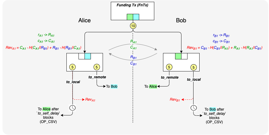 rA1->RA1and her per-commitment key pair:cA1->CA1. - Bob will have his revocation_basepoint key pair: