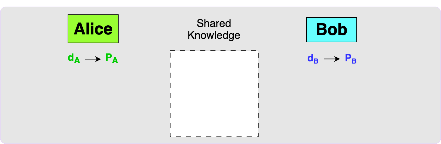 This first diagram shows the initial state: Alice and Bob both have private keys and the corresponding public keys and currently the two parties have no shared knowledge.