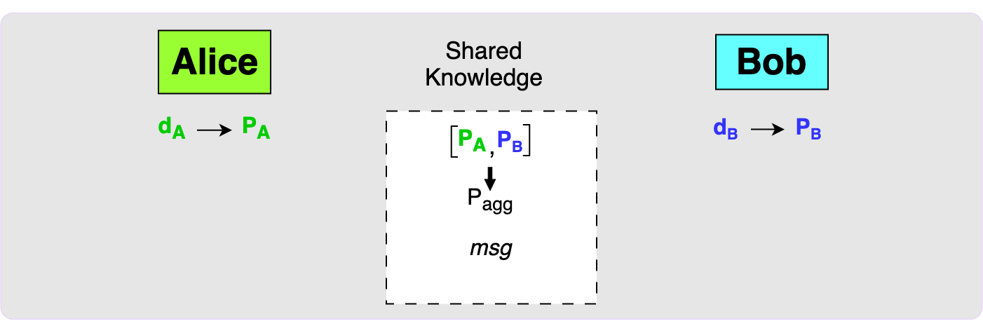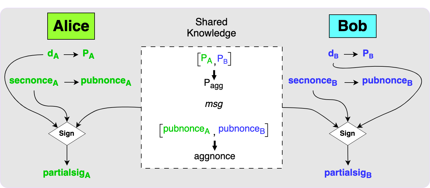 Let’s walk through the case where two parties, Alice and Bob, want to set up a 2-of-2 MuSig2 output and then create a signature to spend from it.