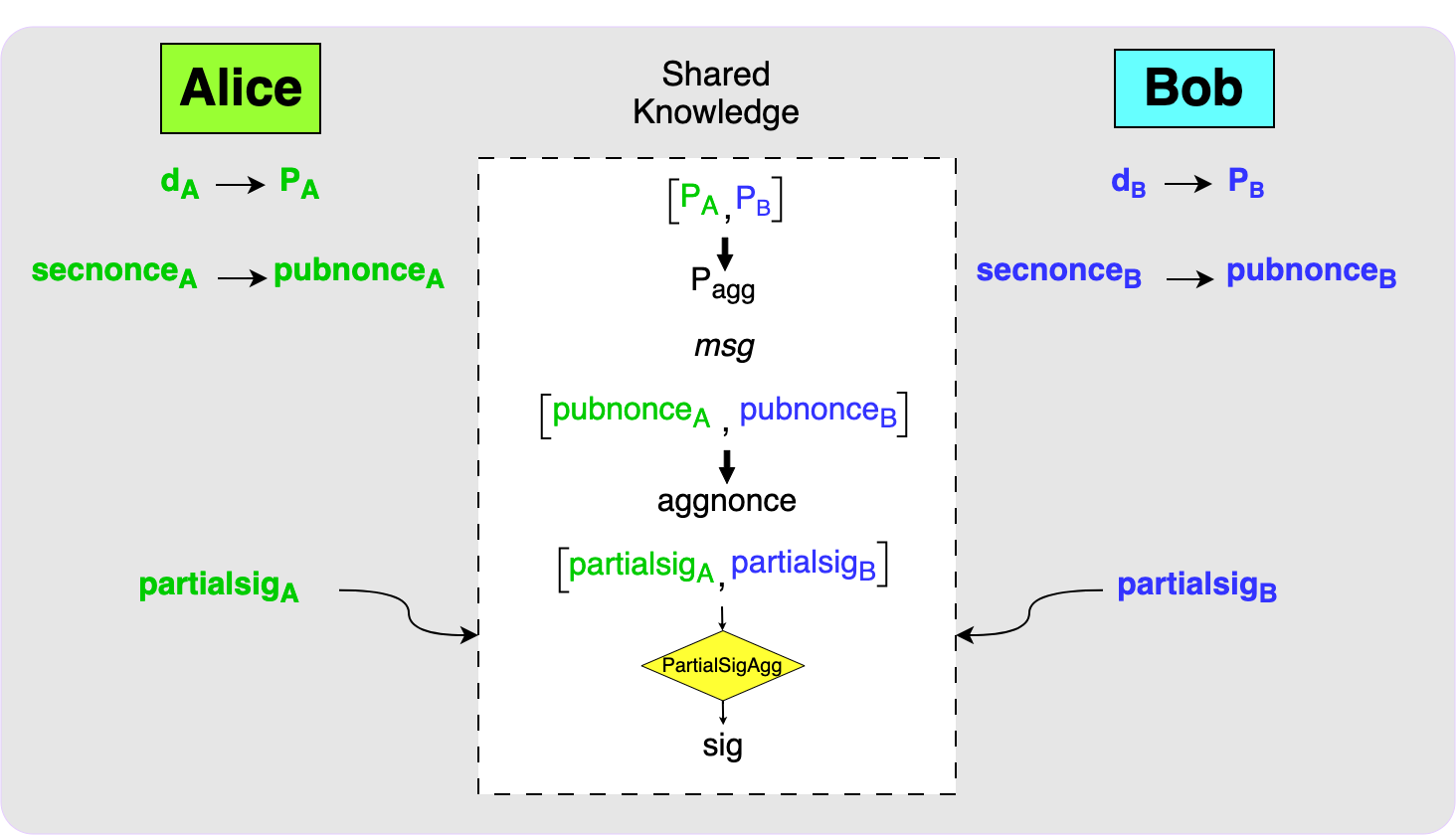 Once Alice and Bob have a shared message that they want to sign (which would most likely be the spending transaction), they can move onto the signing phase.