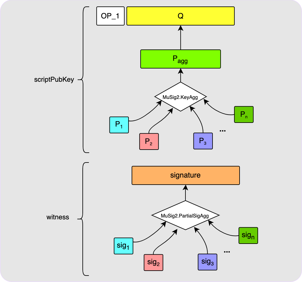The tricky part here is everything that needs to happen off-chain during the setup of this aggregate public key as well as for the creation of the final signature. MuSig2 is the protocol that defines how this should be done. The various steps have been carefully thought through in order to keep the process trust-less and to protect parties from attacks such as key cancellation.